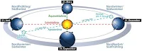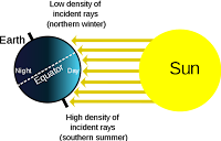 تدور الأرض حول محورها ، وتدو في نفس الوقت حول الشمس . وبسبب ميل محور دوران الأرض الذاتي بالنسبة إلى مستوى دوران الأرض حول الشمس، فإن محور دوران الأرض الذاتي يتخذ إتجاها لا يتغير في الفضاء ؛ وهو مائل عليه بزاوية 5و23 °. بهذا ينشأ الربيع والخريف على الأرض ، كما ينشأ أيضا الصيف والشتاء. تكون أشعة الشمس عمودية على دائرة عرض 5و23 ° شمالا في الصيف ، وترتفع درجة حرارة الشمال . في نفس الوقت تكون أشعة الشمس غير عمودية مع دائرة عرض 5و23 جنوبا ، فيكون شتاءا في جنوب الكرة الأرضية .