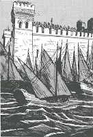 وبعد أن نفدت السهام جرى التراشق بالحجارة، ومن أجل ذلك كانوا "يجعلون في أعلى الصواري صناديق مفتوحة من أعلاها يسمونها التوابيت يصعد إليها الرجال قبل استقبال العدو فيقيمون فيها للكشف ومعهم حجارة صغيرة في مخلاة معلقة بجانب الصندوق يرمون العدو بالأحجار وهم مستورون بالصناديق".